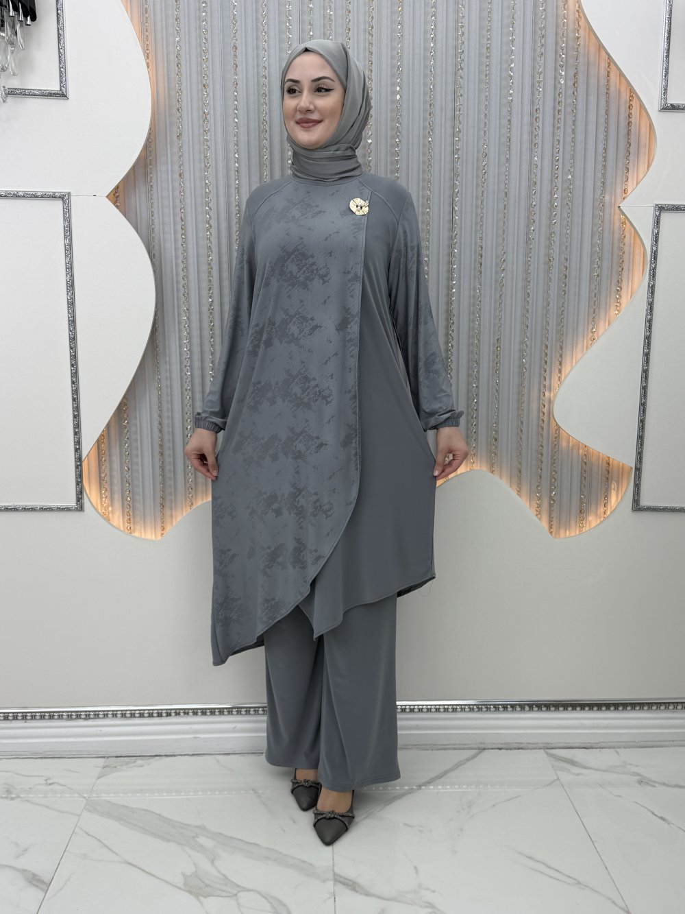 Gülümser Pantolonlu Takım Gri