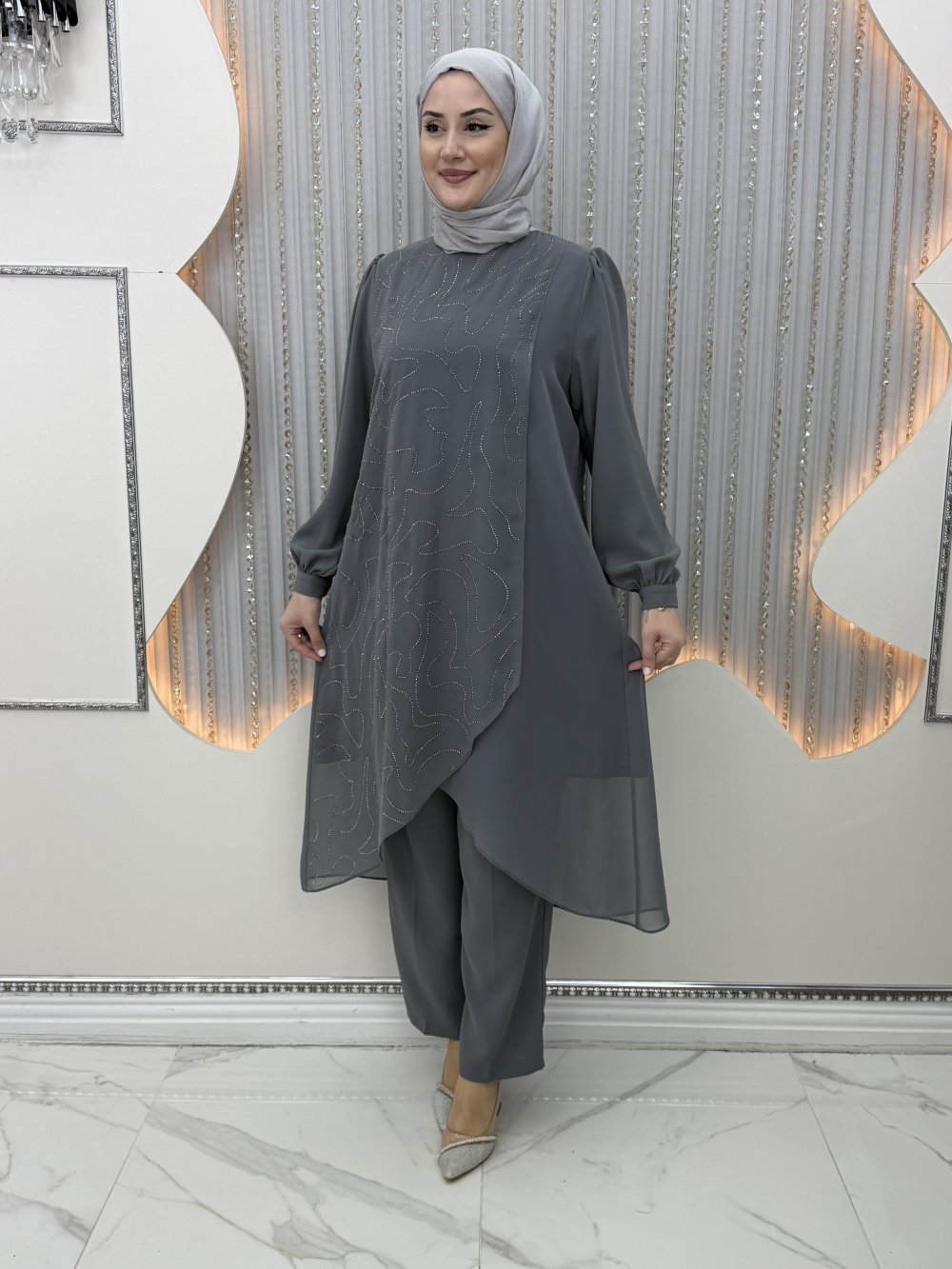 Parlayan Pantolonlu Takım Gri
