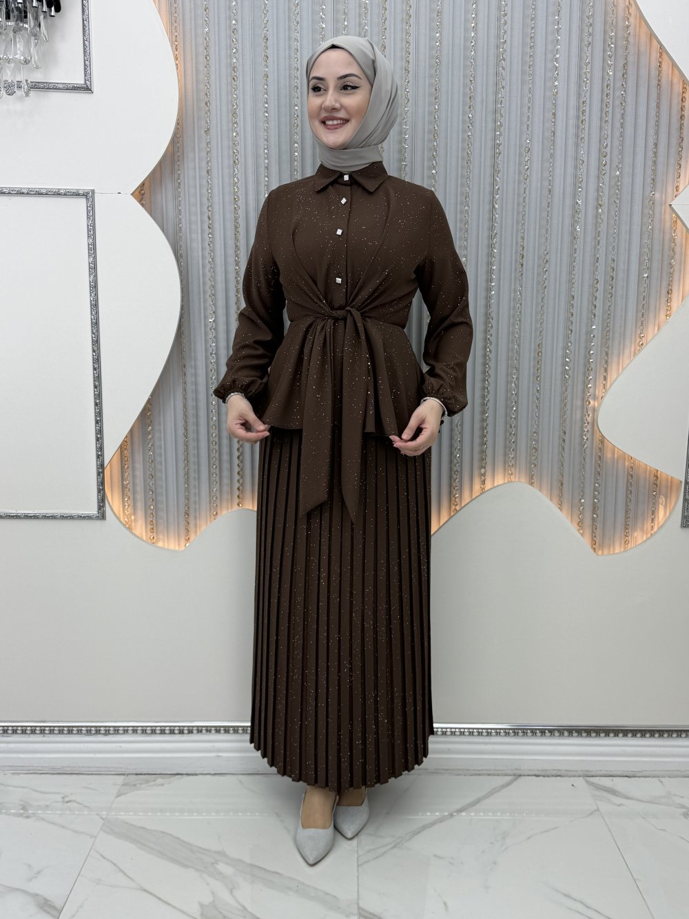Pırıltı Etekli Takım Kahverengi
