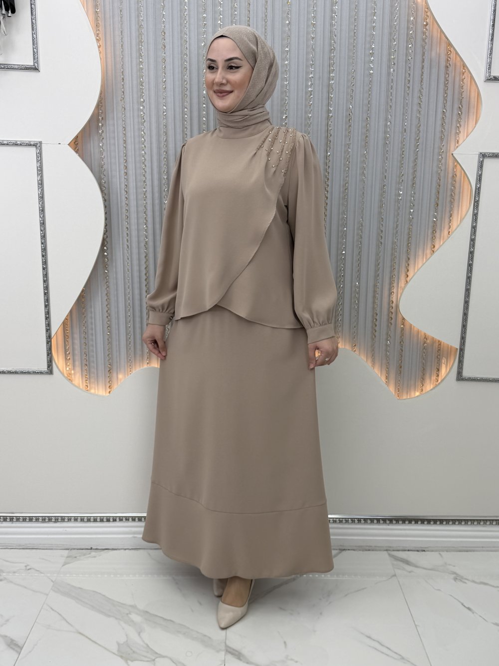 Tek omuz taş detaylı